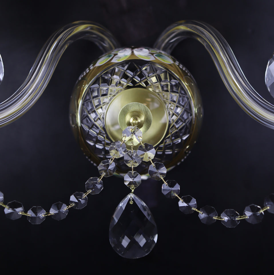 Chụp đèn thủy tinh trong suốt được khắc họa hoa văn tỉ mỉ, kết hợp với các họa tiết vàng đồng tinh xảo.